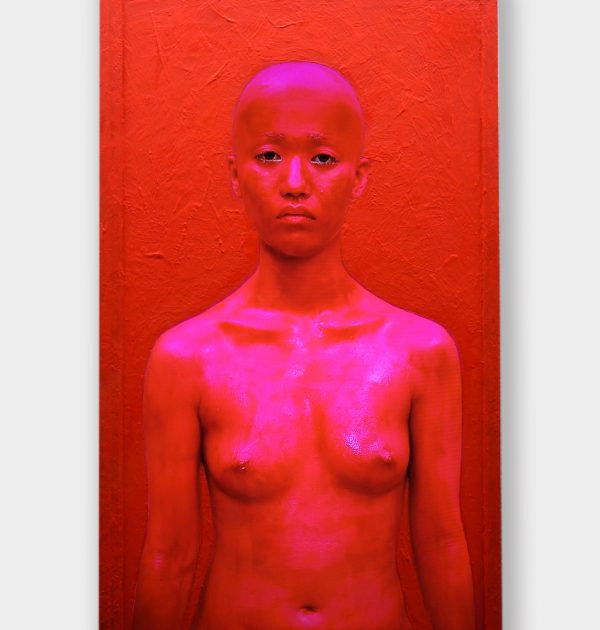 Pour nous, les téléphones intelligents, la connexion à Internet à tout moment et partout, complète l’être humain. Ce travail utilise la peinture corporelle pour examiner nos définitions de la physicalité, notre physicalité dans un monde de dispositifs d’information en réseau. Chaque œuvre de cette série de portraits montre une personne, nue, rasée et entièrement peinte d’une seule nuance, affichée sur un écran LCD lui aussi entièrement peint de la même couleur. Avec ces frontières effacées, le fond et le premier plan représentent respectivement un corps électronique et un corps humain, chacun recouvert de la même couleur de peinture. L’oeuvre enquête ainsi sur le sentiment d’ambiguïté et de confusion qu’elle génère et qui nous oblige à nous questionner quant à la nature du sujet représenté, qu’il soit un être humain ou une représentation fictive. En plus de ces aspects formalistes, ce travail traite également de l’«existence» dans les médias. Si nous connaissons tous l’horizon de longévité du corps humain, celui des données, de la peinture et tout simplement de l’art reste quant à lui encore une source de débats. Les multiples horizons temporels du body art, de la peinture figurative et de l’art numérique s’entremêlent donnant vie à un terrain commun pour l’œuvre, focalisée sur le présent et sur l’existence.
